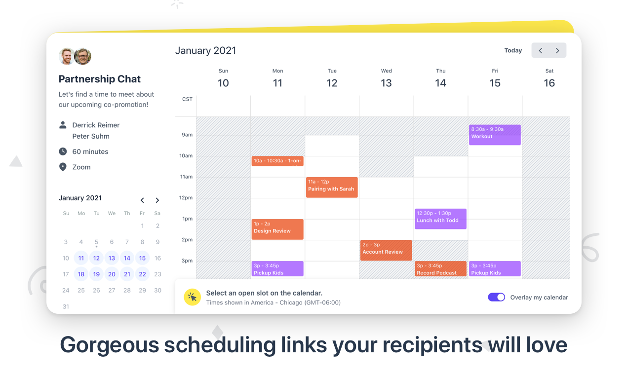 Features: Calendly is currently the most popular app available on the market, and for good reasons. With its simple interface and elegant calendar-like design, guests can easily book a meeting with you in just a few clicks.
