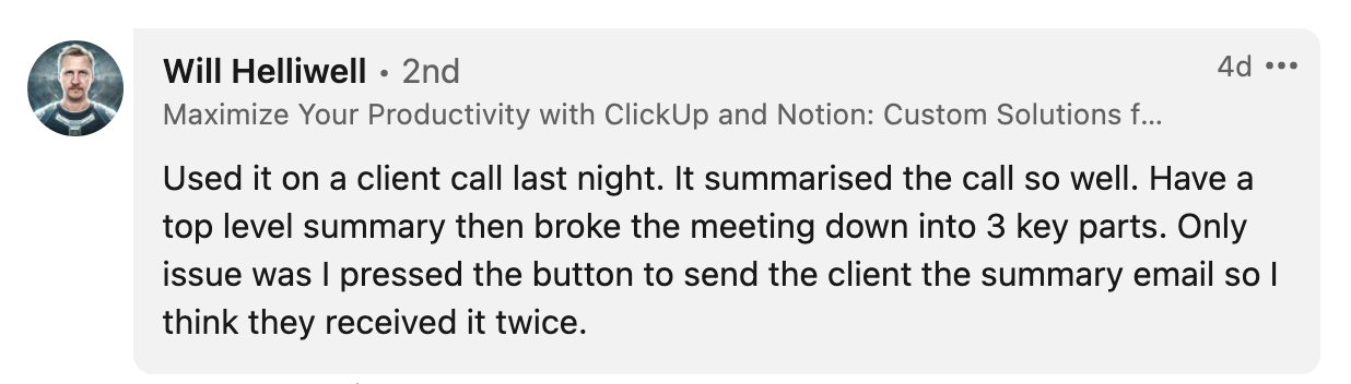 • Meeting summary: one paragraph outline of the call written by a bot but sounds like a human speech;