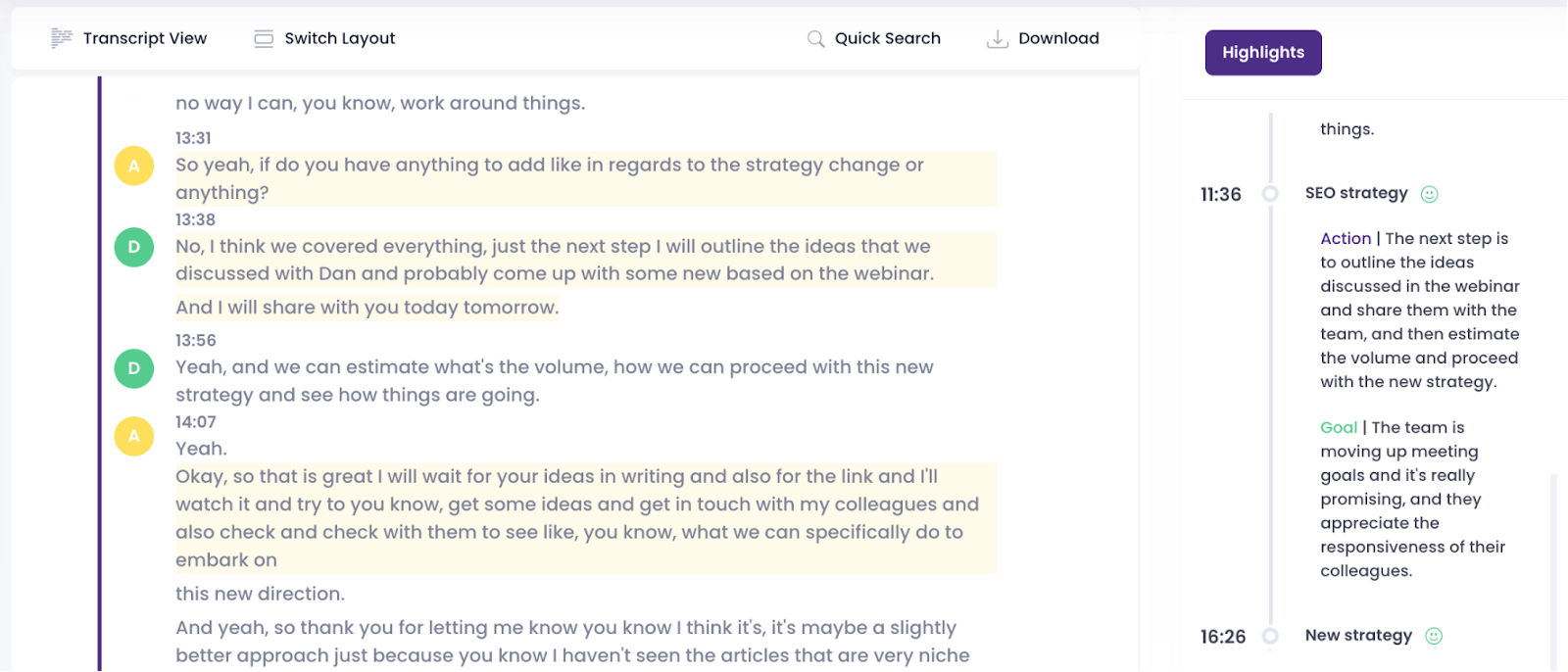 Speaking of productivity, taking good meeting notes that you’ll actually be able to use later on is mandatory. Our virtual meeting assistant EmeetGeek not only automatically records, and transcribes your meetings, but also extracts the key points, questions, and comments using the keywords you provide. That way, you’ll never have to think about manually taking meeting notes again.