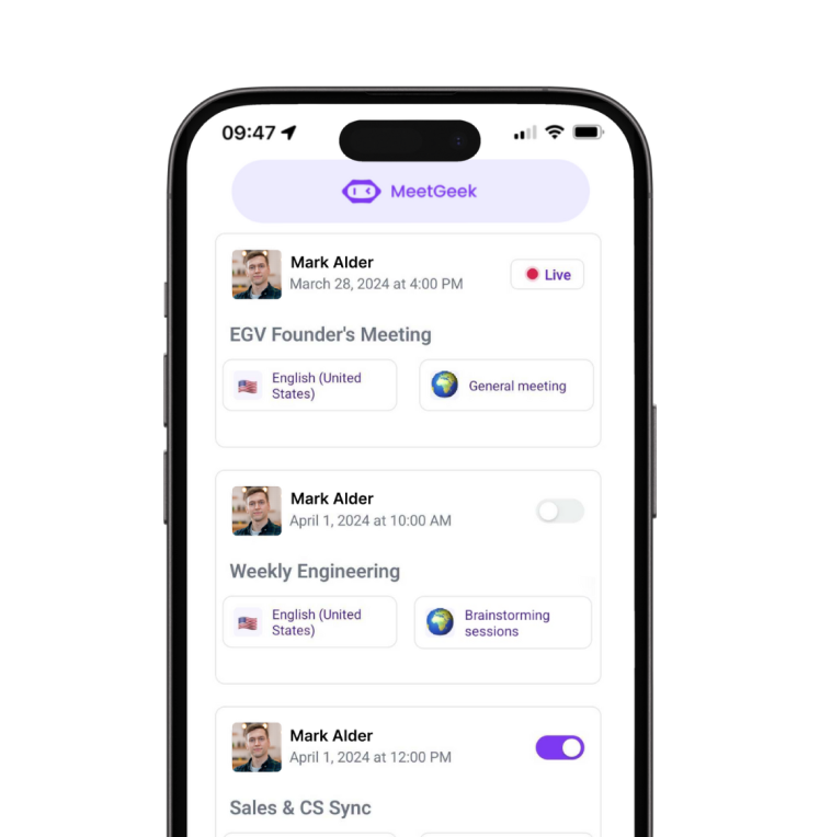 Use EmeetGeek mobile and web apps to record and automatically transcribe both in-person and virtual meetings.