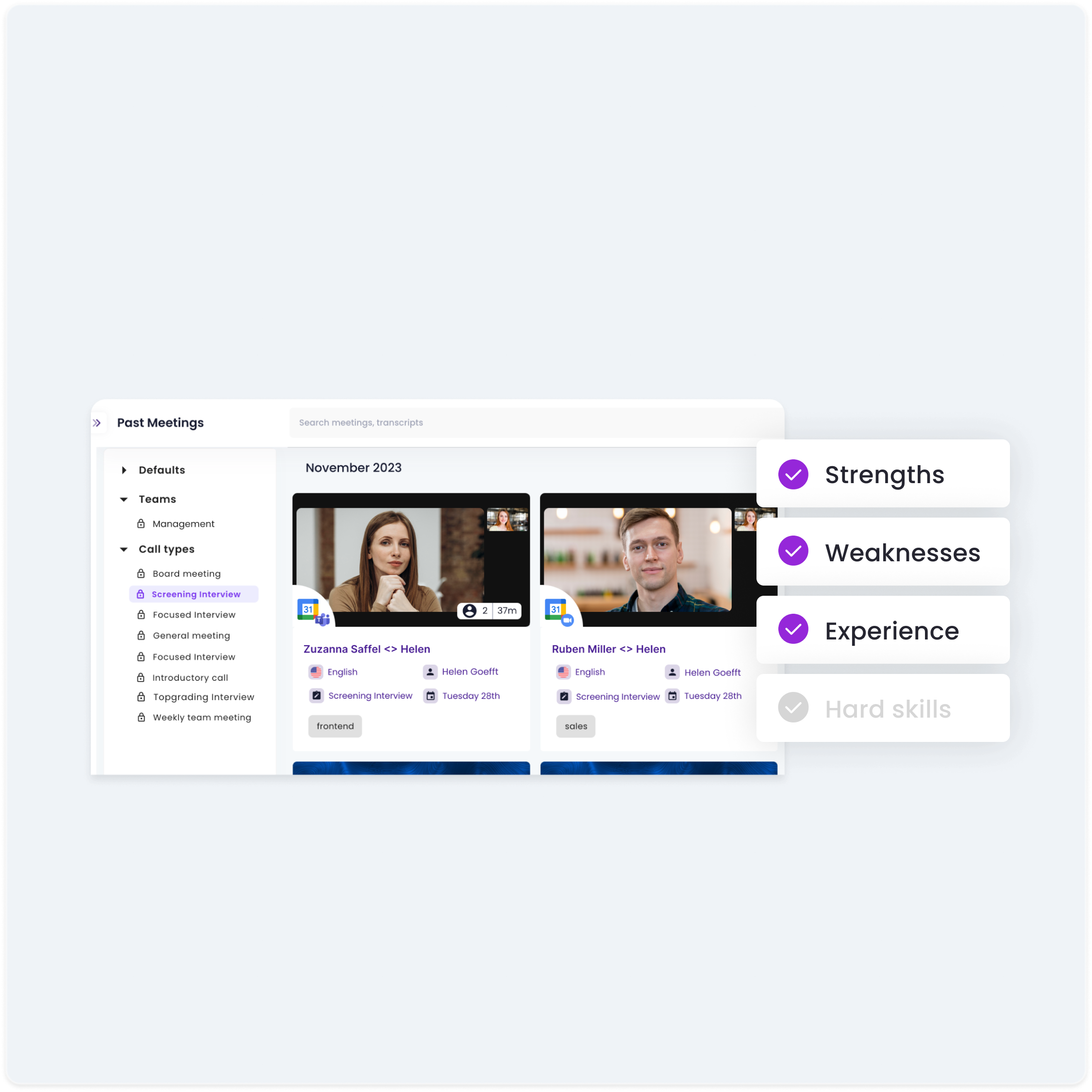 Empower your team to share meeting takeaways and stay in sync with a secure, unified, and searchable library of past meetings, organized by meeting types, teams, and custom tags. Create teams and automatically exchange knowledge without adding extra meetings to your calendar.